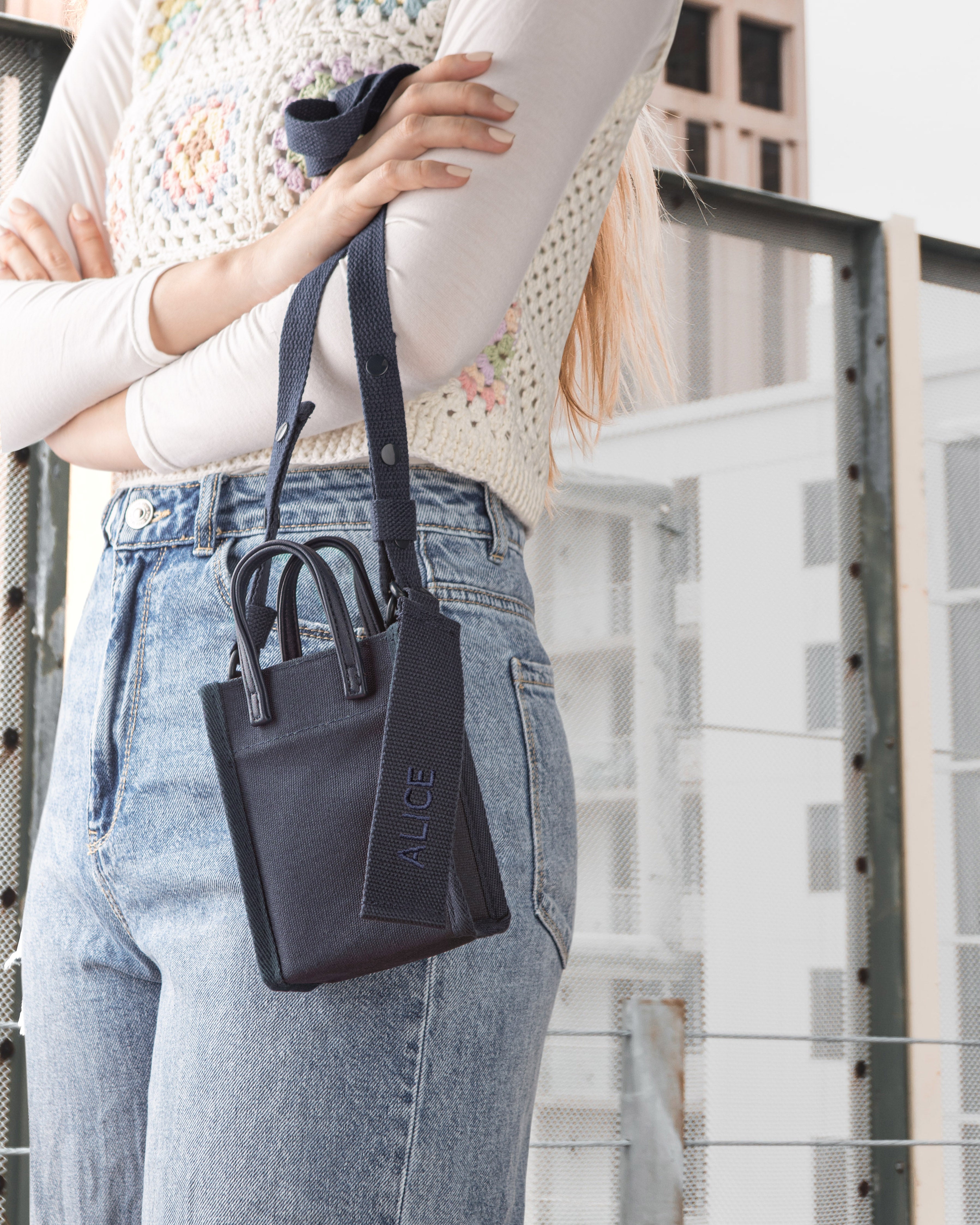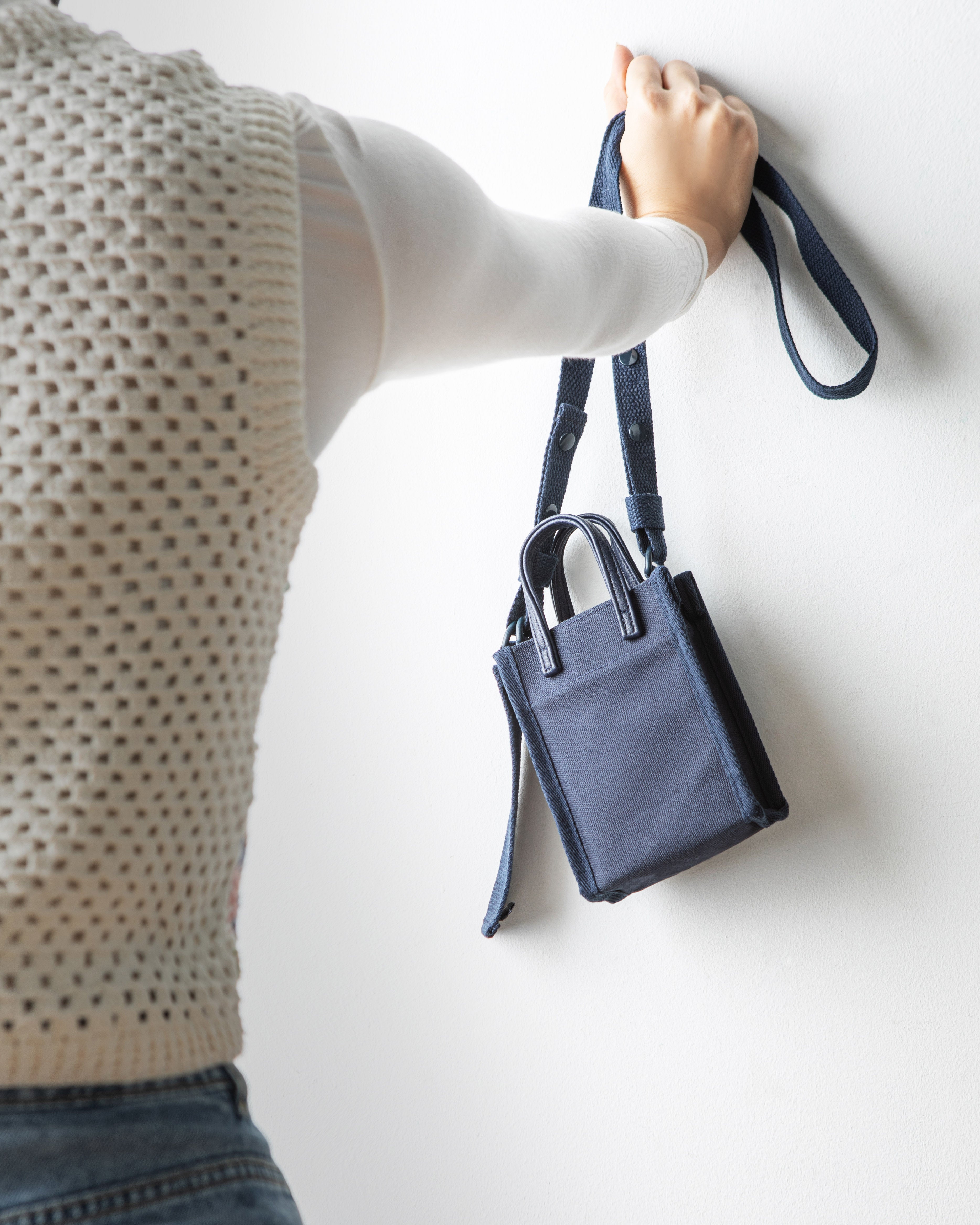 Crafted from engineered canvas and enhanced with grosgrain top handles and an adjustable crossbody strap, this minimalist and petite crossbody bag keeps a phone, cardholder, passport, keys, mini snacks, lipstick, and a parking ticket; without additional items to weigh you down.