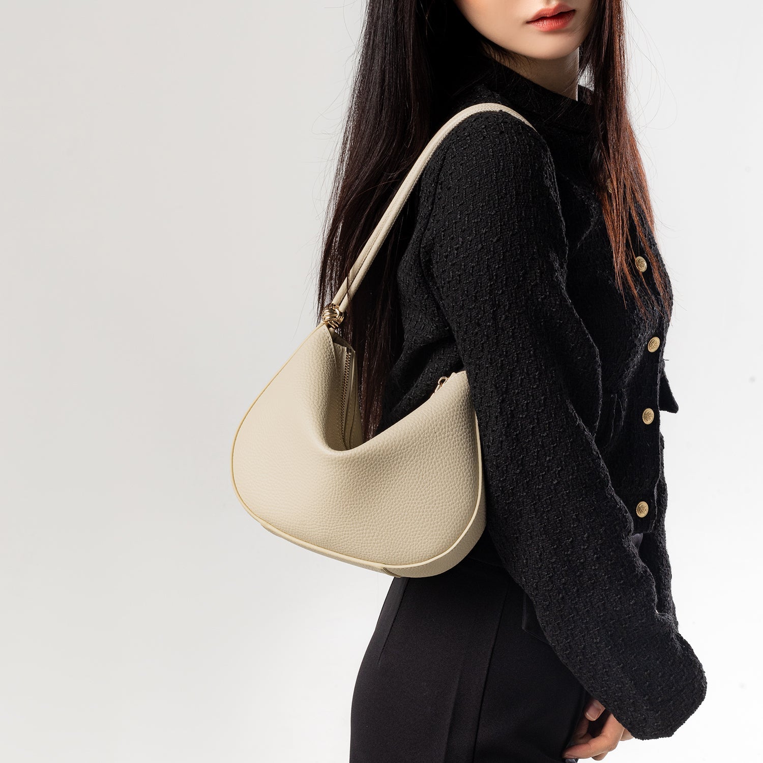 The essence of the collection lies in the luxurious golden lucky knot hardware and clean lines inspired by the shape of a fortune cookie. The Knoty shoulder bag seamlessly blends modern sophistication with heritage charm, creating a timeless piece.