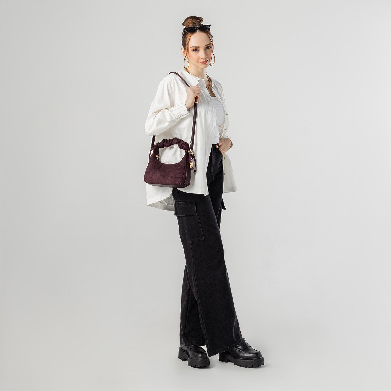 Carry it three ways: grab it by the scrunchie handle, sling it over your shoulder, or wear it crossbody with the long strap. The padded body has a soft, velvety texture, giving the bag a refined and understated look.